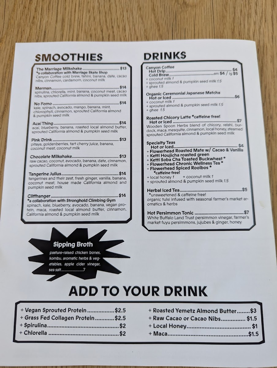 If smoothies are more your speed, the No Fomo smoothie, crafted with nutrient-rich kale, spinach, avocado, and more, is not just a treat for the taste buds but also packs a nutritional punch. And for those with a slight sweet tooth, the Chocolate Milkshake, made with raw cacao and coconut, will certainly tickle your fancy while ensuring your breakfast is both delightful and nutritious.