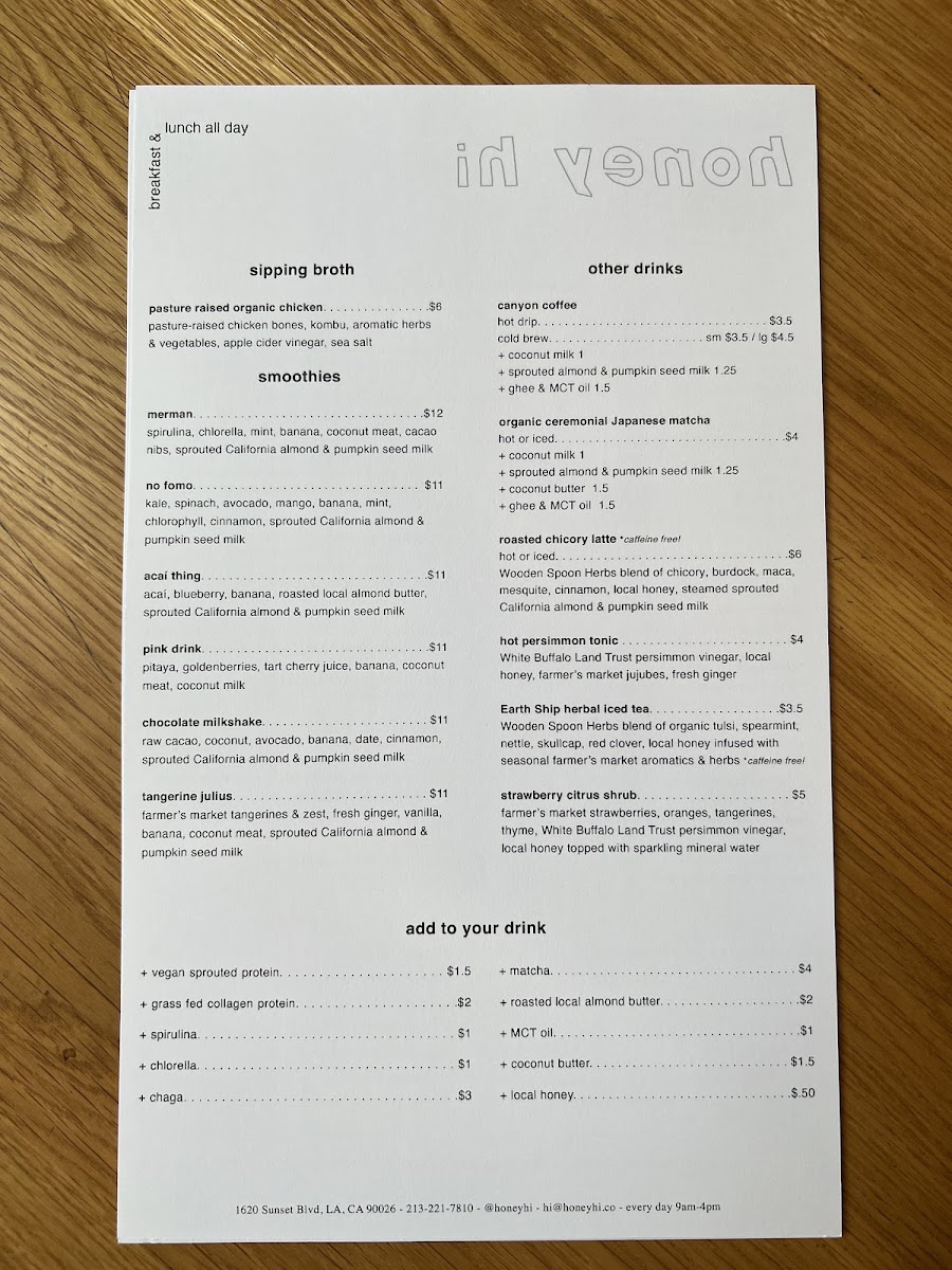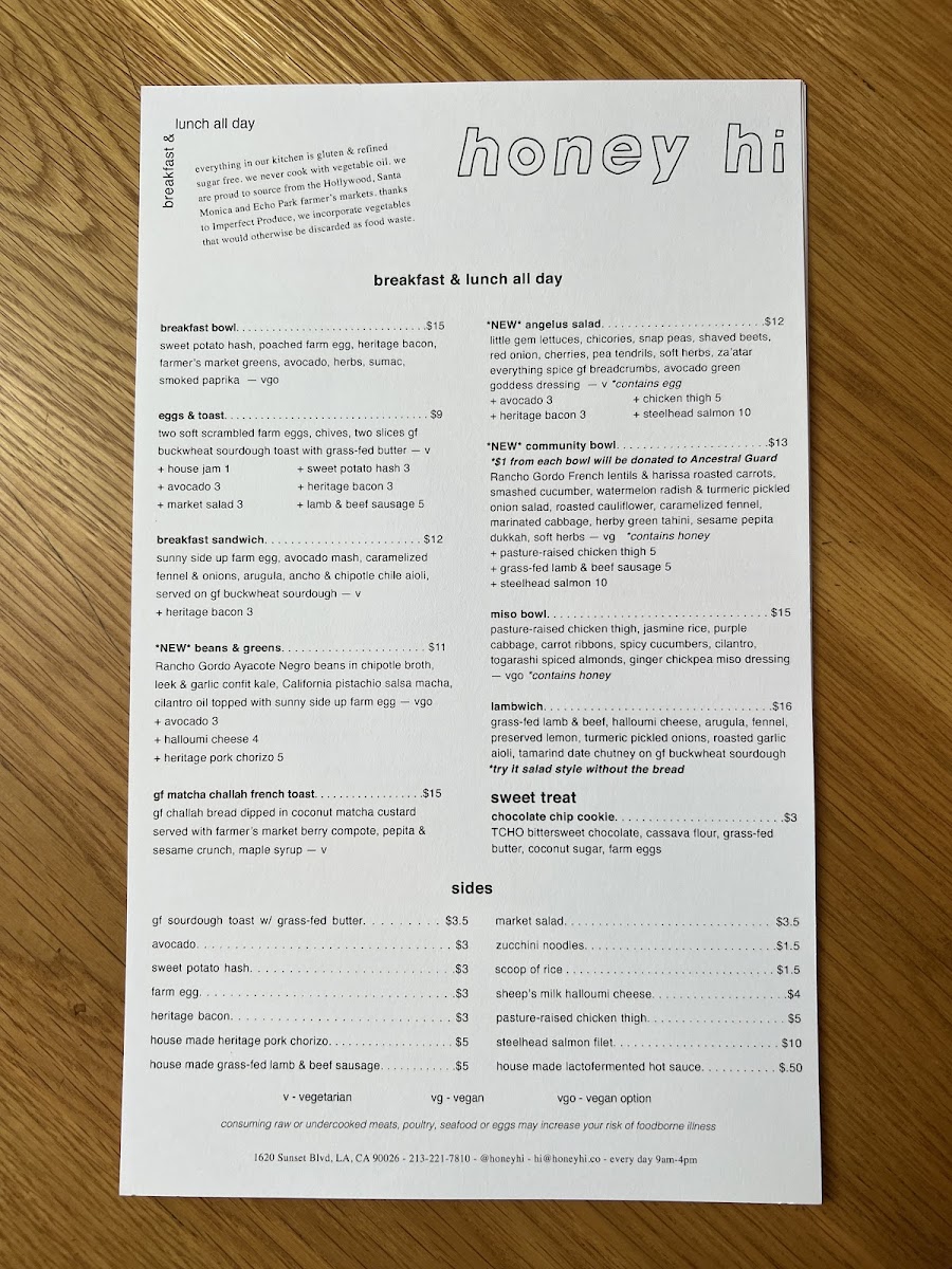 All in all, Honey Hi is a treasured spot for health enthusiasts or anyone looking to enjoy a refreshing and innovative breakfast in Los Angeles. Whether you're seated outside savoring the city’s energy or perched comfortably inside, you’ll leave with a renewed sense of flavor and inspiration. Make your way to Honey Hi and experience breakfast the way it should be: fresh, wholesome, and utterly delicious.